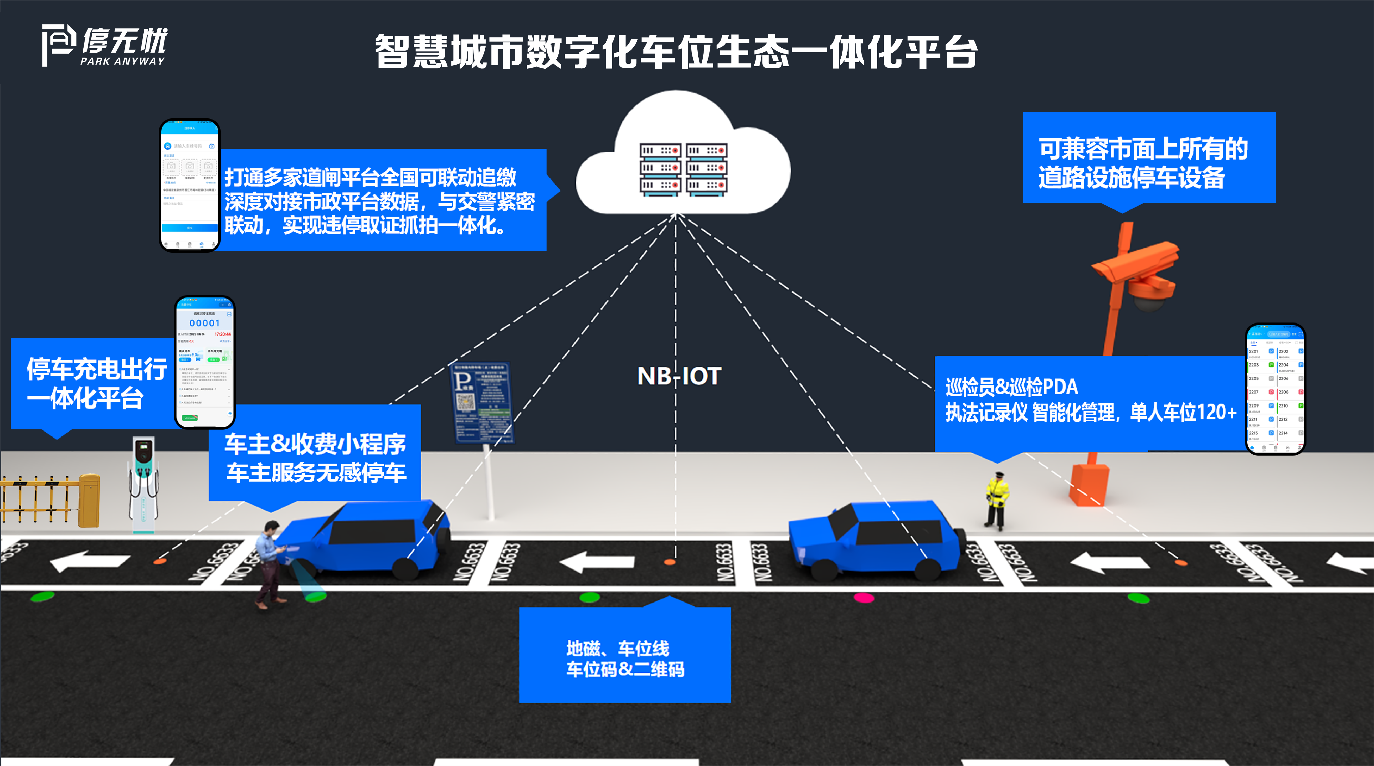 核心技术:车位内置高精度传感终端、统一数字编码、专属智能电子二维码标识,实时采集车位占用、车辆信息、使用时长等数据,同步上传至停无忧智慧停车云平台。